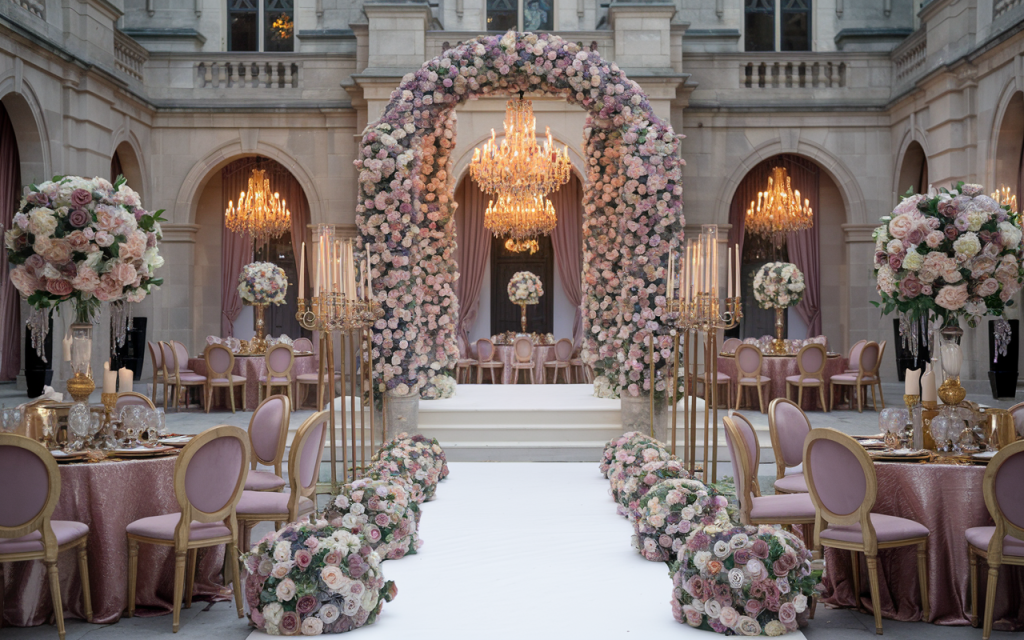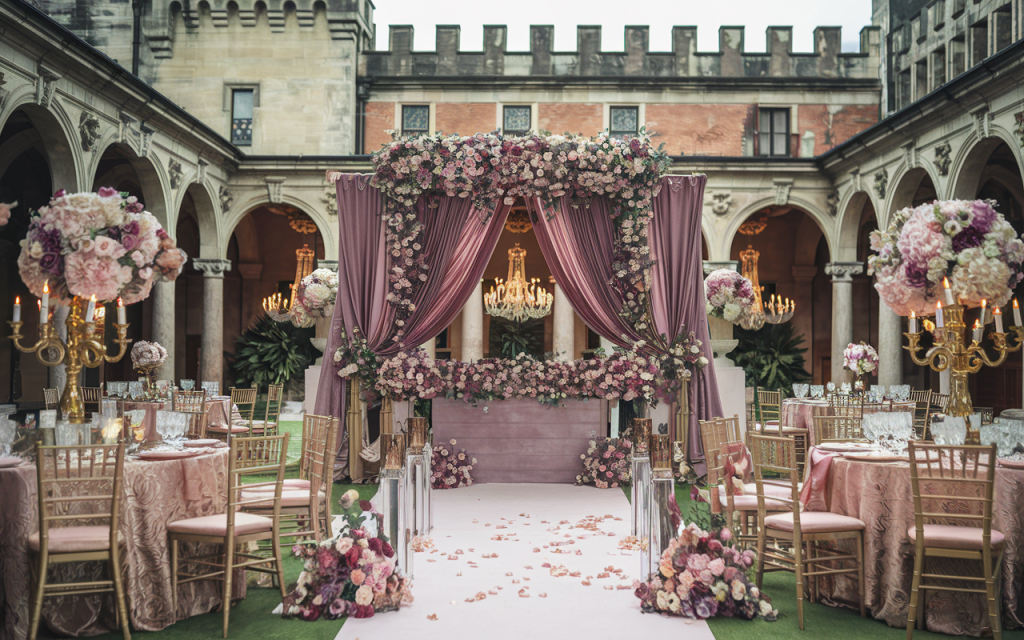 A breathtaking floral-draped altar, framed by cascading velvety plum drapery, stands at the heart of the courtyard, illuminated by the soft glow of golden chandeliers. A pristine aisle, lined with lush floral arrangements in deep berry and blush hues, guides the way to vows exchanged under the watchful eyes of history. The air is thick with the scent of fresh roses, peonies, and hydrangeas, mingling with the echoes of a bygone era.