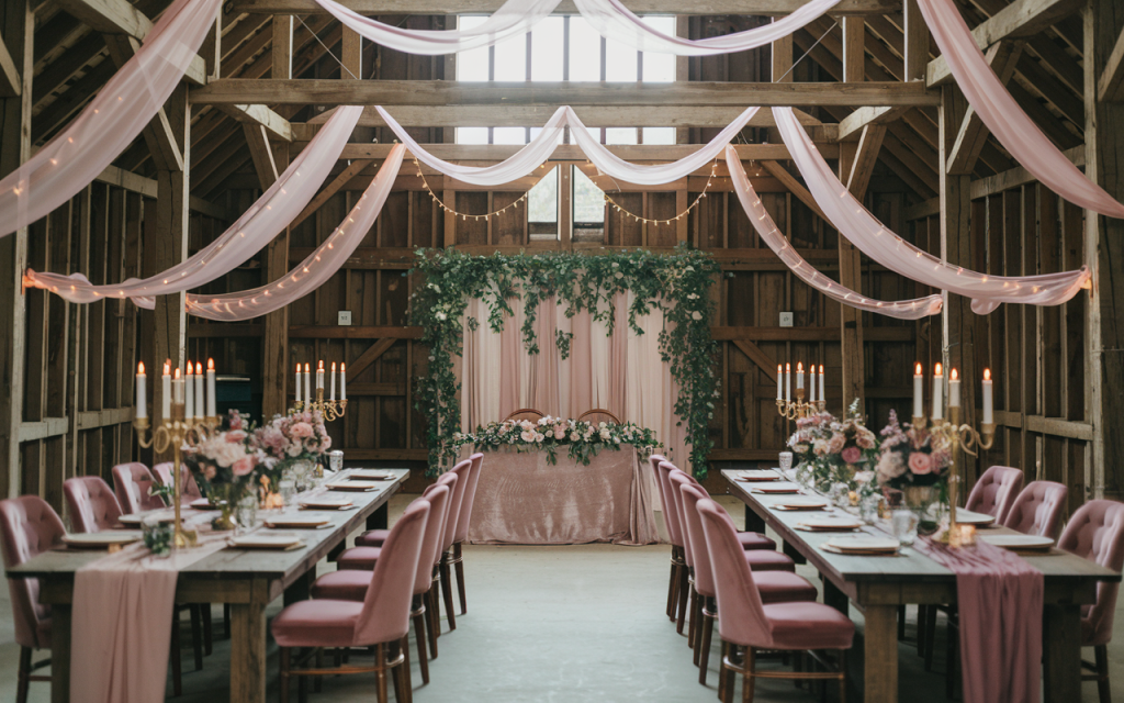 The Rustic Blush wedding is a dreamy fusion of countryside warmth and soft, romantic elegance. Under the exposed wooden beams of a charming barn, this intimate reception is bathed in candlelight, draped in flowing fabrics, and wrapped in the warmth of rustic sophistication.