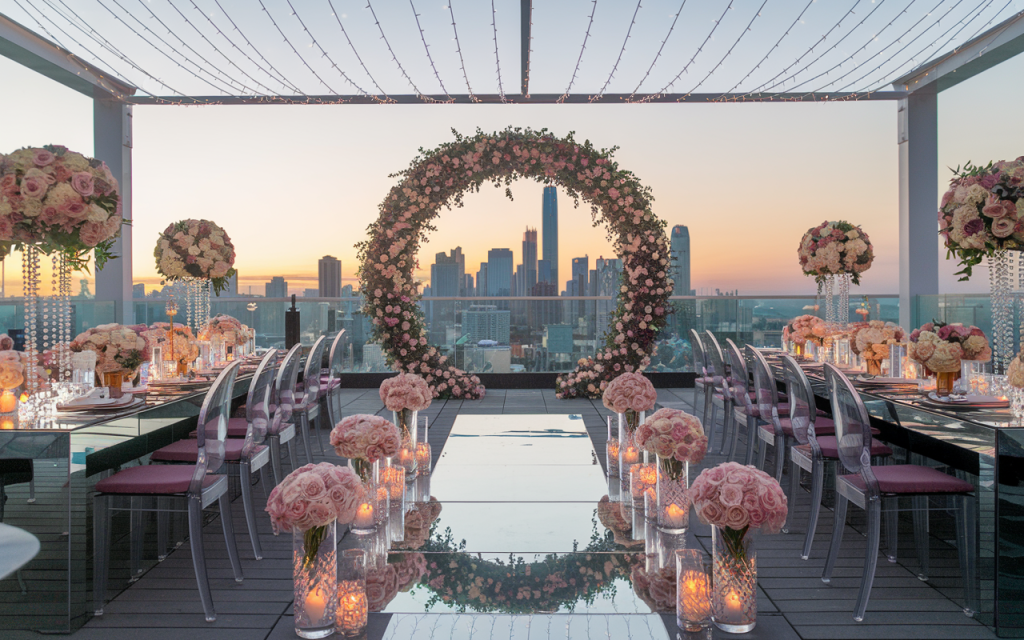 At the heart of this stunning rooftop venue stands a magnificent circular floral arch, lush with blush and ivory roses, perfectly framing the panoramic cityscape. A mirrored aisle reflects the golden hues of the fading sun, leading to an intimate altar where vows will be exchanged against the twinkling horizon.