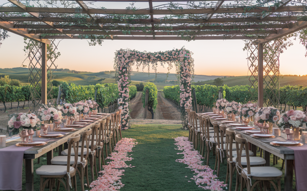 Beneath a wooden pergola entwined with climbing vines, long rustic tables are elegantly set with blush-toned linens, rose gold accents, and crystal glassware. Overflowing floral arrangements bring a sense of softness, while warm candlelight flickers as the evening unfolds.