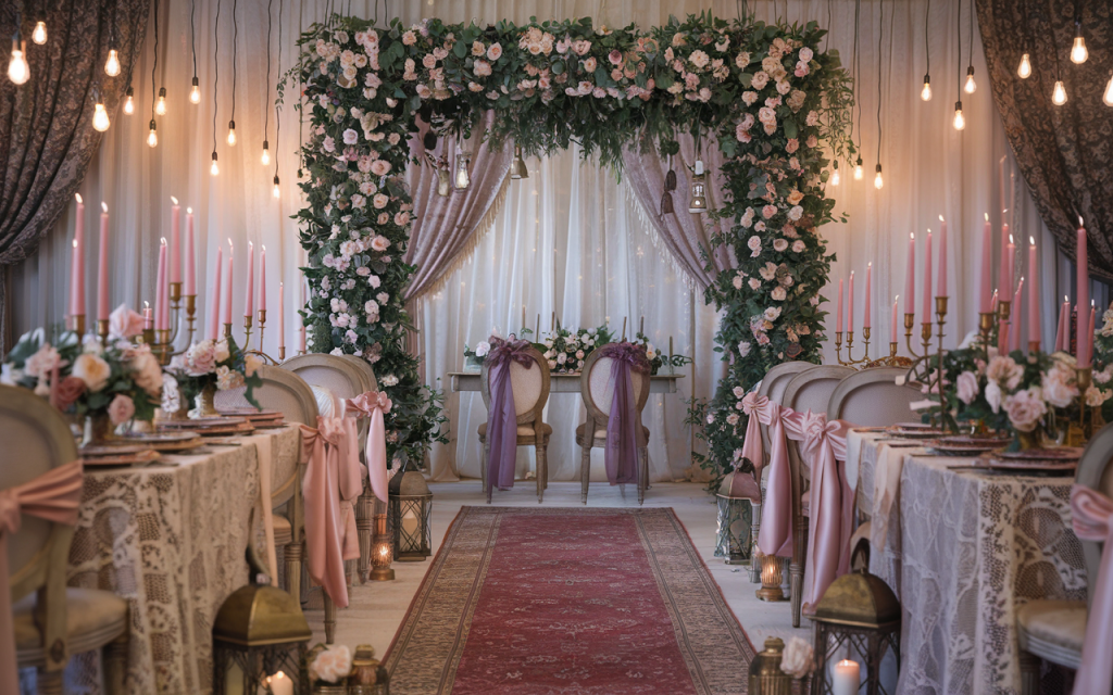 A rustic wooden arch, draped in flowing rose-hued fabric, stands adorned with lush arrangements of pampas grass, blush roses, and delicate greenery. The aisle, lined with golden lanterns and scattered petals, leads to an intimate altar where love takes center stage.