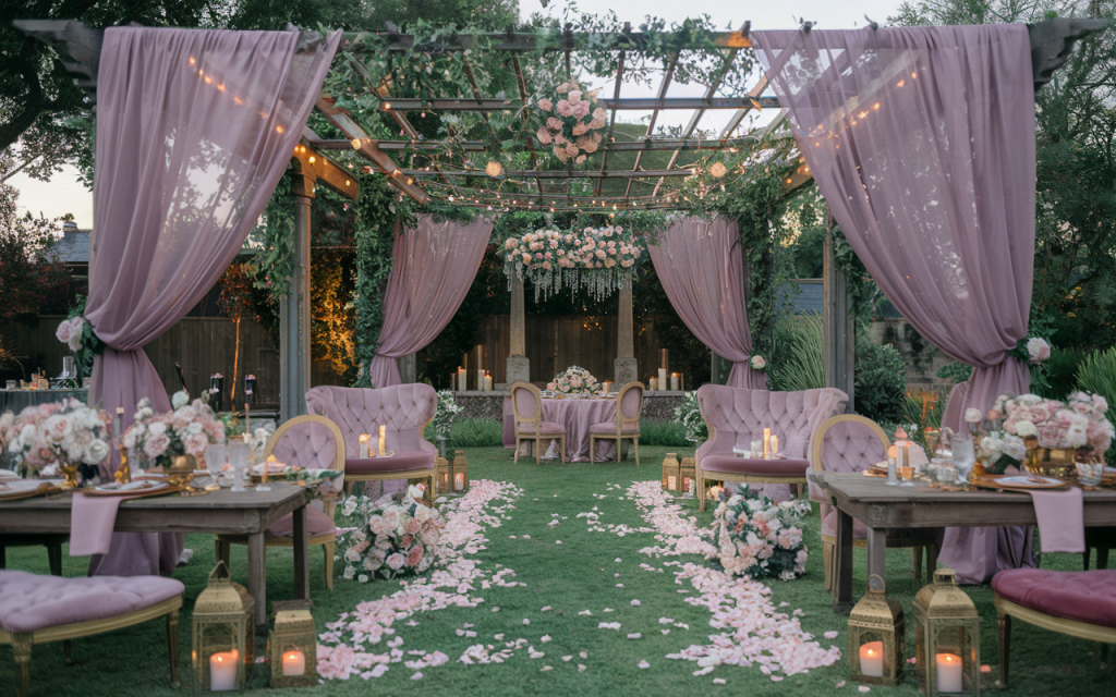 The Whispering Blooms wedding setting is a vision of dreamy elegance—where soft lilac hues, cascading florals, and golden candlelight transform a garden into a sanctuary of love. Beneath a vine-covered pergola, draped in sheer lavender fabric, an intimate altar awaits, framed by twinkling string lights and the natural embrace of lush greenery.