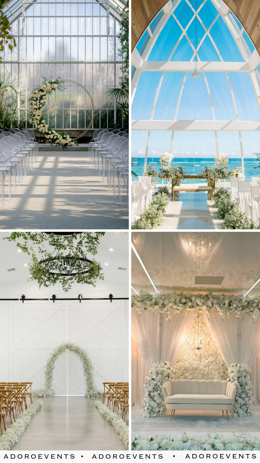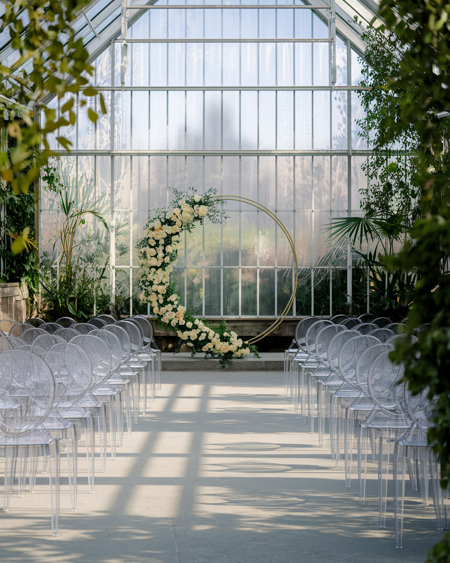 Between the greenhouse glow, the dreamy ghost chairs, and that golden moon arch spilling with blooms, the whole space feels like it was made for quiet promises and second glances. I can already hear the gentle shuffle of guests, the creak of a slow breeze, and the faint hum of something romantic playing off a hidden speaker.