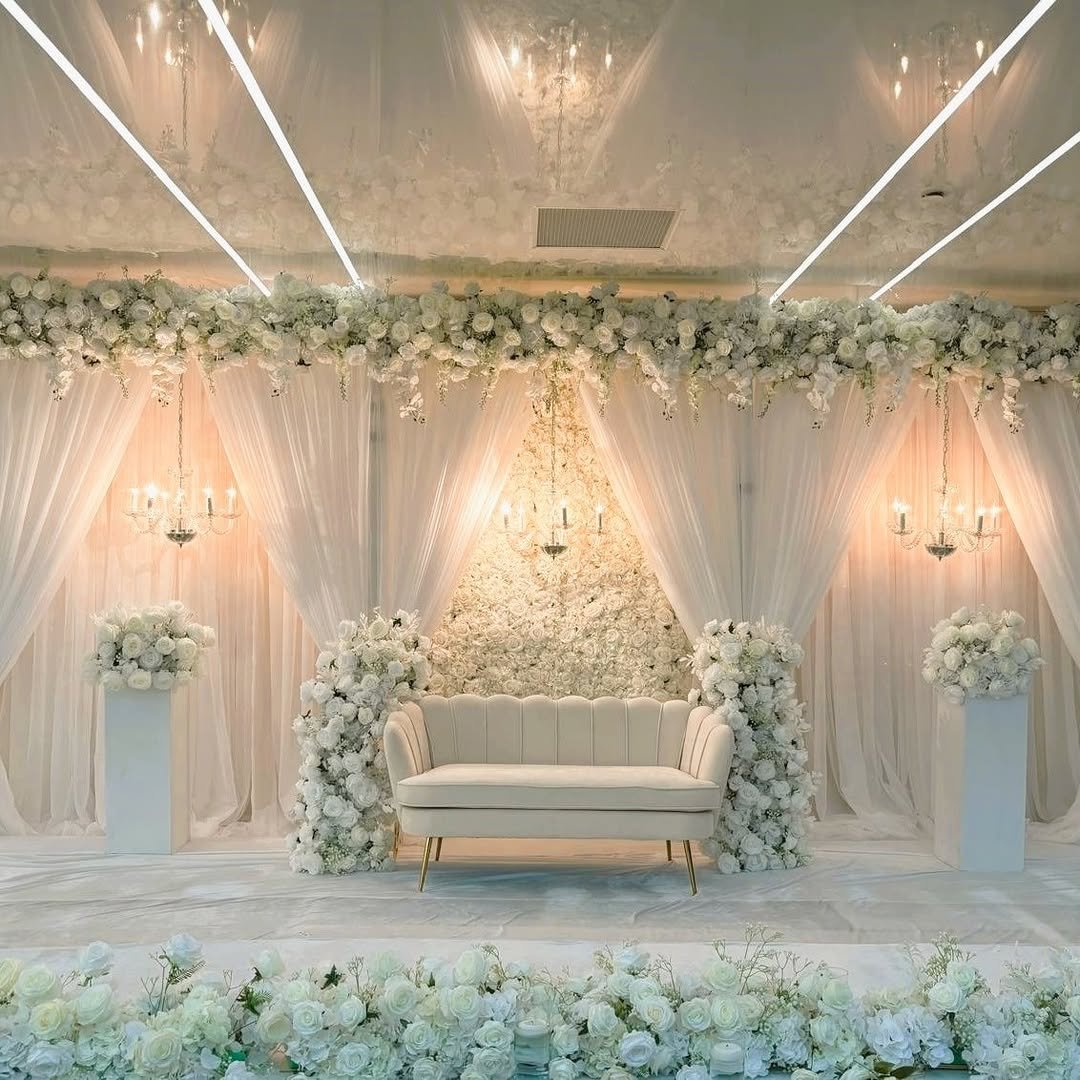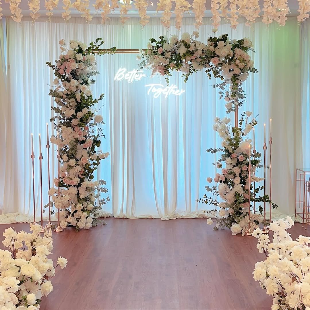 Everything here is simple, but meaningful. Just enough blooms, just enough glow. The kind of setup that doesn’t try to outshine the couple—it just wraps around them like a warm hug.
