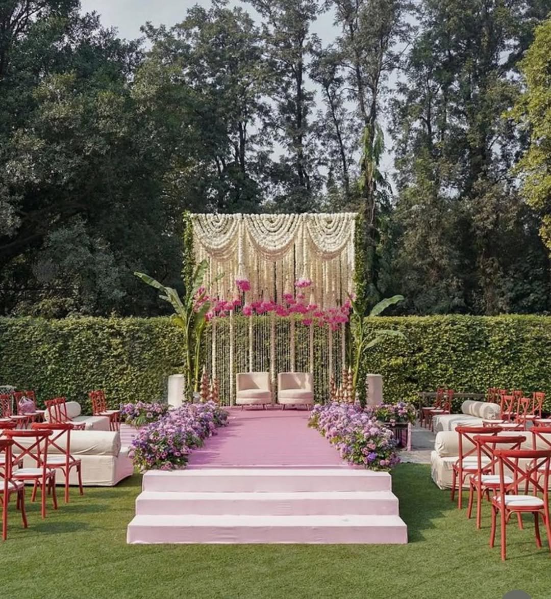 This dreamy setup by @easemyweddingg is everything I love about minimalist weddings—soft, intentional, and quietly showstopping. A blush aisle leads to twin ivory chairs framed by a cascade of jasmine garlands, scalloped like vintage drapery, with playful pops of fuchsia just floating above.