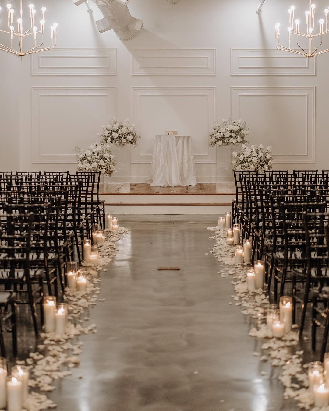 There’s no excess—just warm candlelight flickering along a petal-strewn aisle, black chiavari chairs lined with intention, and creamy florals anchored against crisp white walls. It’s moody in the most elegant way, like a glass of champagne at midnight.