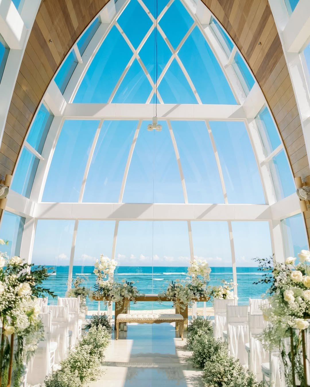 The architecture made me pause. It’s grand without being overwhelming, like a chapel carved from light and sea breeze. Baby’s breath lines the aisle, white florals cascade just enough, and the ocean does the rest.