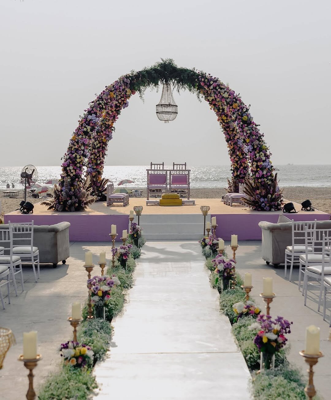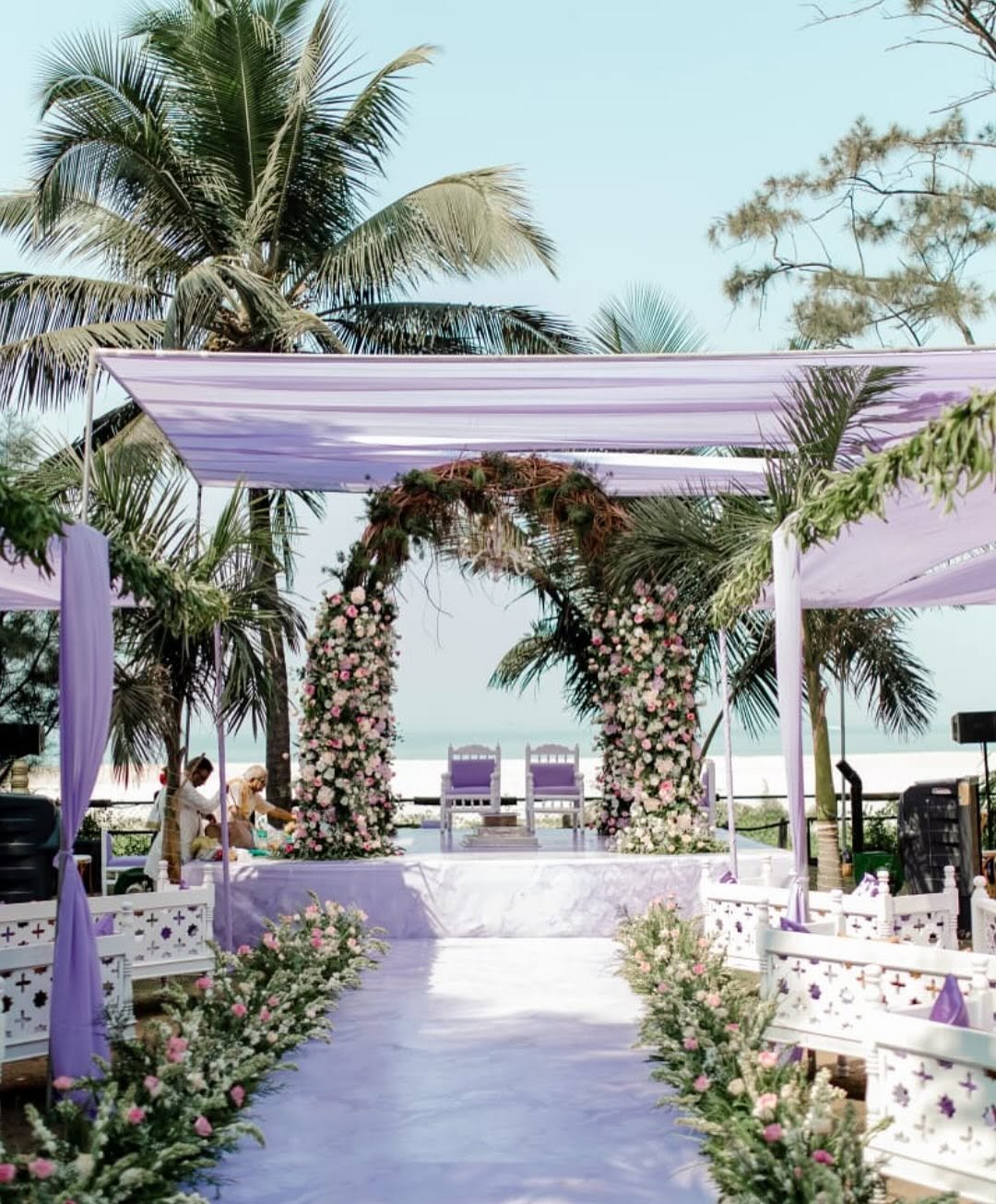 I didn’t expect to fall in love with lavender on the beach—but this setup had me rethinking everything. There’s something so serene about soft lilac draped under swaying palms, with just two chairs facing the sea like they’ve been waiting there forever.
