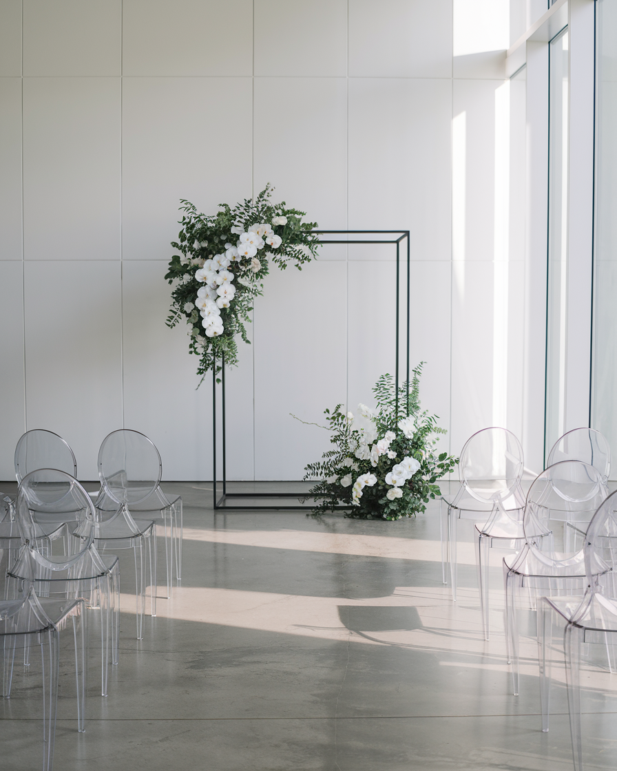 The sculptural metal arch was a moment—bare, intentional, and dripping just enough with orchids and ferns to make me lean in closer. And those ghost chairs? I’ve never seen seating look so unbothered and chic at the same time. Honestly, it felt like the room took a deep breath and just let the love take center stage.