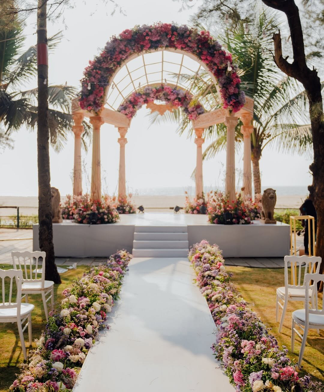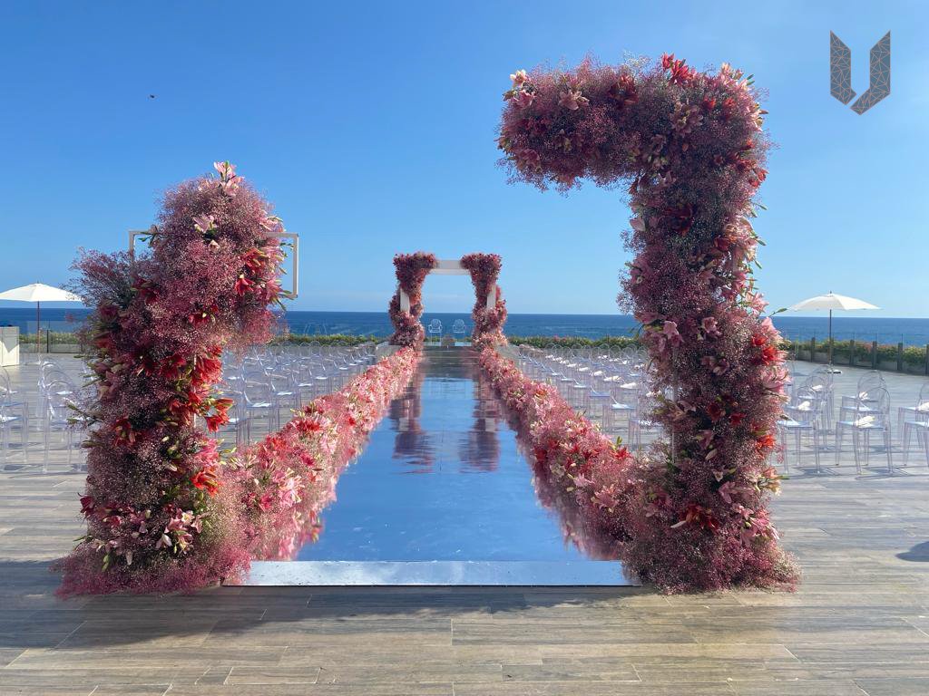 I didn’t think florals could take my breath away until I saw this aisle. Winding down through layers of soft lavender, blush, and cream, it felt like walking through a blooming fairytale on the edge of the sea.