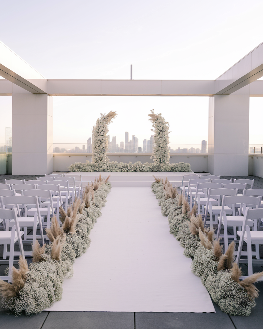 This rooftop scene was everything—clean lines, soft light, and baby’s breath hugging the aisle like a cloud with good taste. I couldn’t stop staring at those sculptural pillars of florals at the altar, rising just high enough to frame the city without competing with it. And yes, I fully considered pocketing a sprig of pampas grass on the way out (don’t worry, I behaved).
