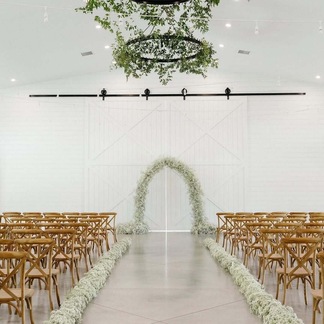 There’s no need for drama when everything is this considered. The arched backdrop, the warm wood chairs, the whitewashed barn doors—it all works together in that effortless “oh this old thing?” kind of way.
