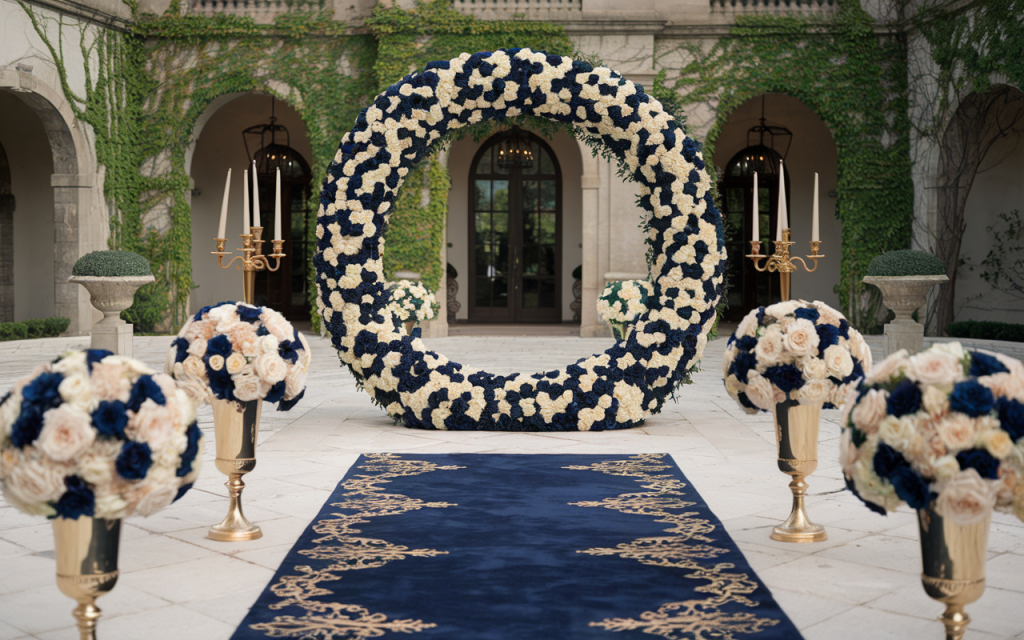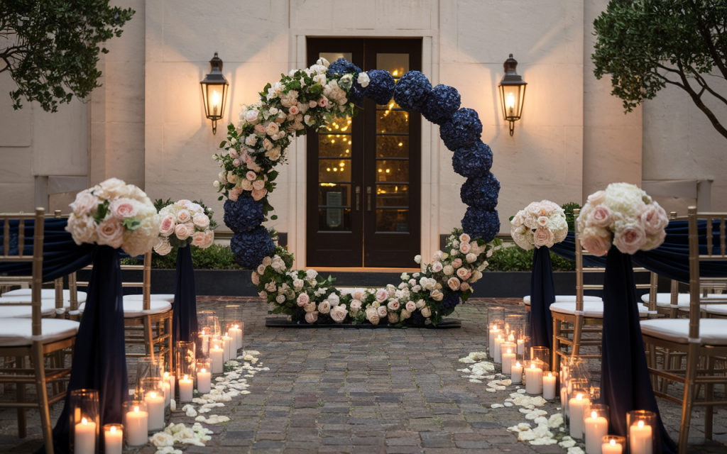 Soft candlelight flickers against the cobblestone path, leading to a breathtaking floral arch that feels almost celestial in its design. This courtyard ceremony blends timeless romance with modern sophistication, featuring a striking circular arch adorned with deep navy hydrangeas and soft blush roses.
