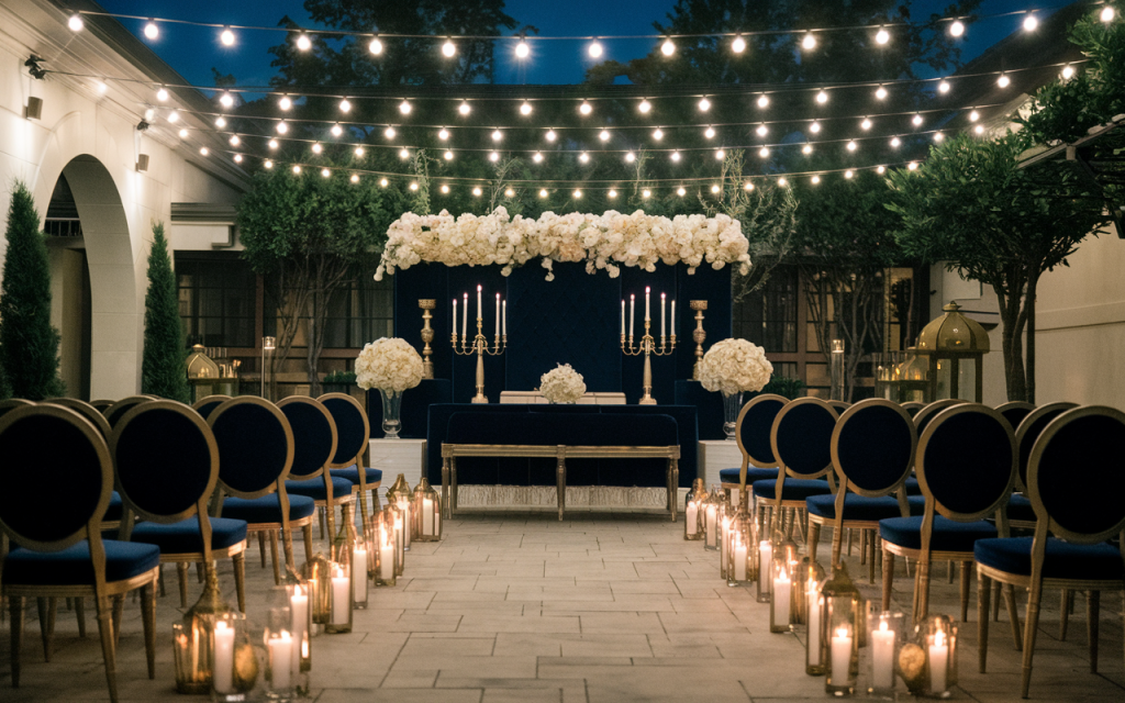 The deep navy aisle runner, embroidered with intricate gold filigree, guides guests toward the altar, flanked by towering floral arrangements in gilded vases. Graceful candelabras add an old-world charm, their flickering flames casting a romantic glow over the courtyard.