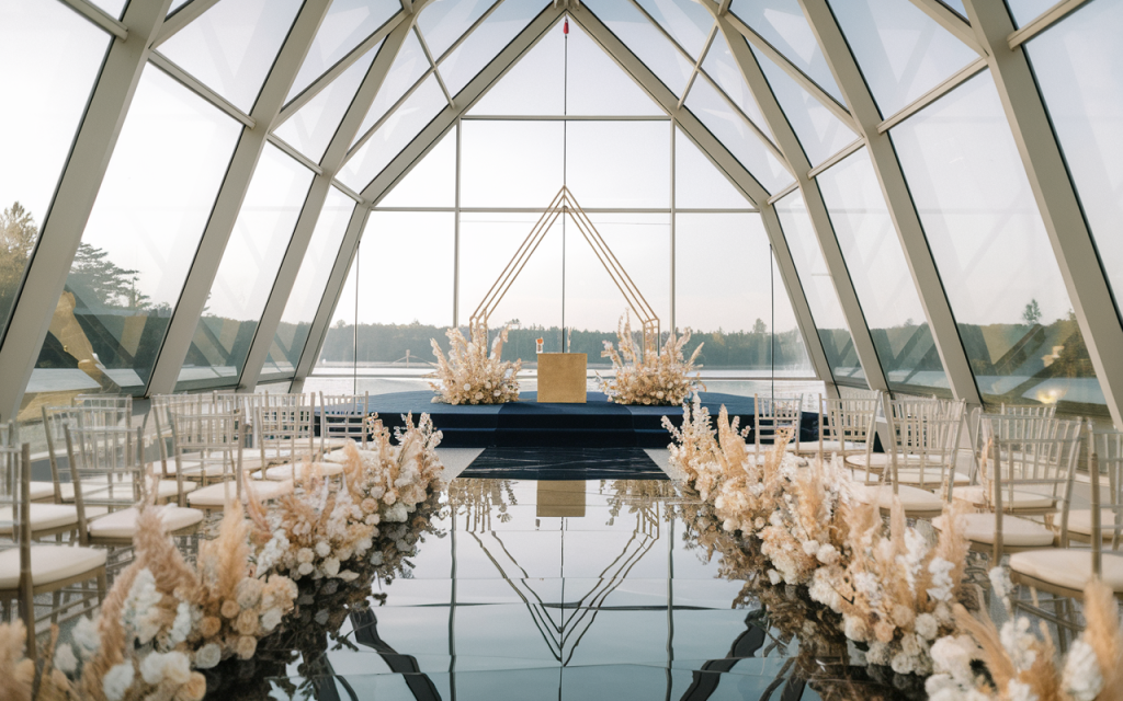 The Ethereal Reflections wedding setup is an architectural marvel, where modern minimalism meets celestial romance. Suspended within a breathtaking glass chapel, this ceremony unfolds in a space where light, water, and air blend seamlessly—creating an ambiance of pure serenity.
