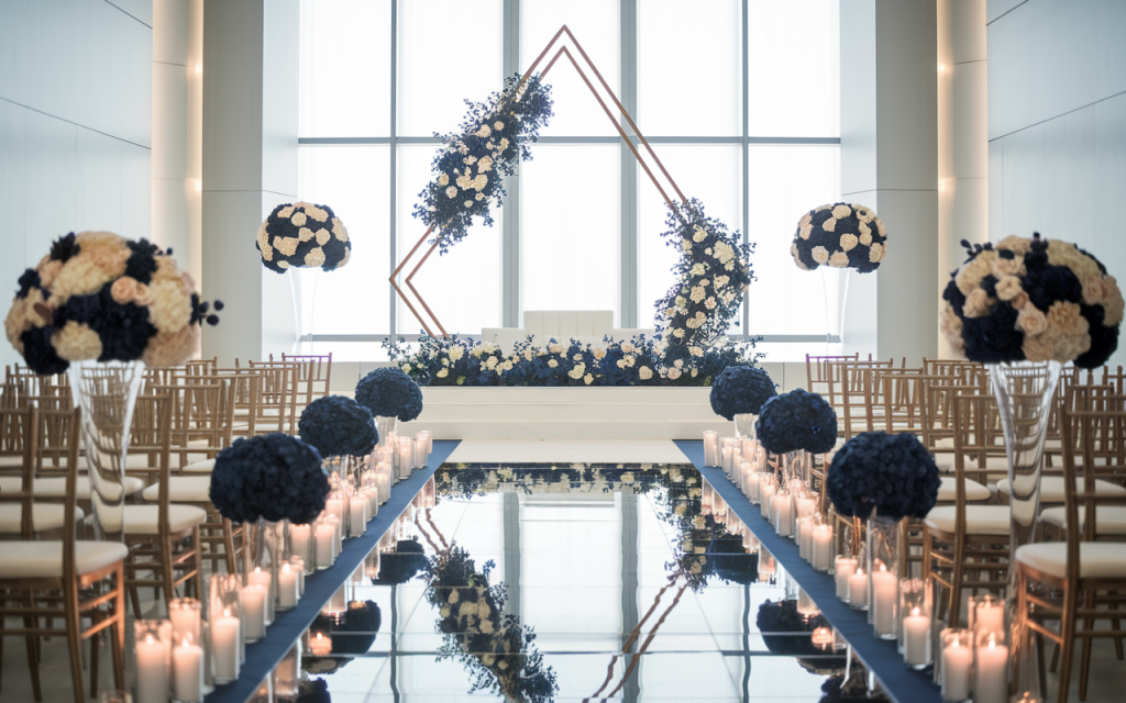 A striking asymmetrical geometric arch, adorned with cascading navy and ivory blooms, frames the altar with sculptural beauty. The mirrored aisle reflects the warm glow of flickering candles, amplifying the ethereal ambiance as it stretches toward the altar. Towering floral arrangements, set in crystal-clear vases, bring a sense of grandeur while maintaining the clean, minimalist aesthetic.