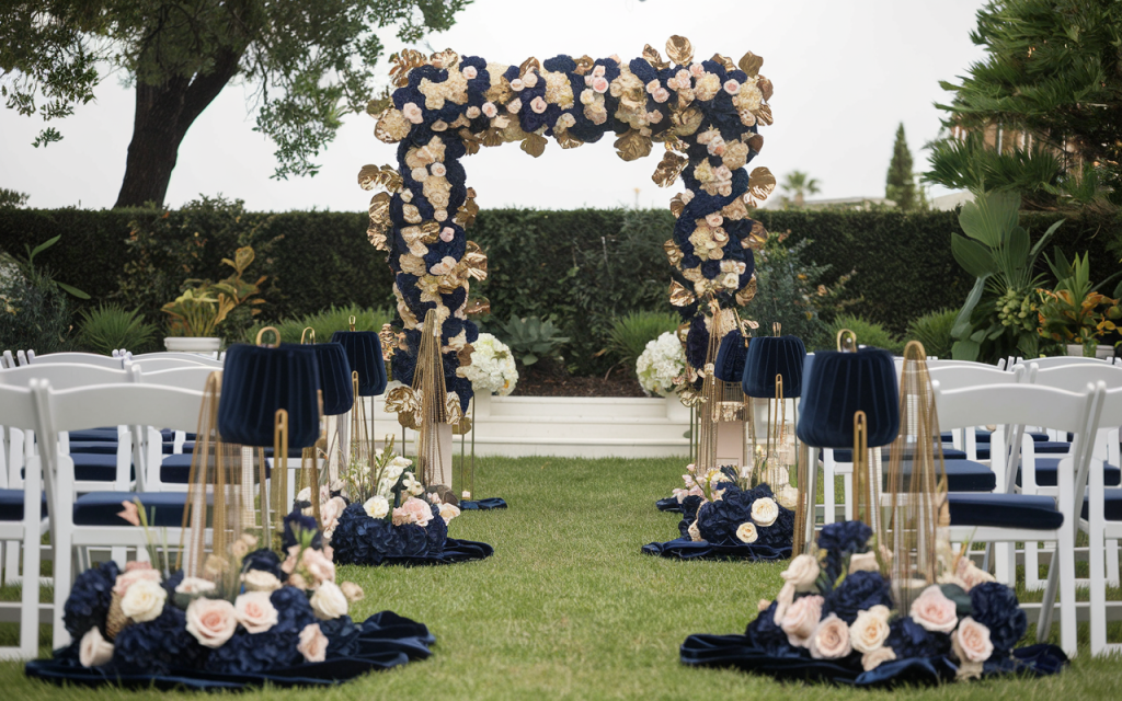 A striking floral arch, adorned with cascading ivory, blush, and midnight-blue blooms, is further enhanced by gilded leaves that shimmer in the soft daylight. The velvet-draped aisle, lined with sculptural golden lanterns and delicate floral arrangements, creates a pathway of pure elegance. White and navy chairs offer a contrast of light and depth, grounding the space in timeless sophistication.