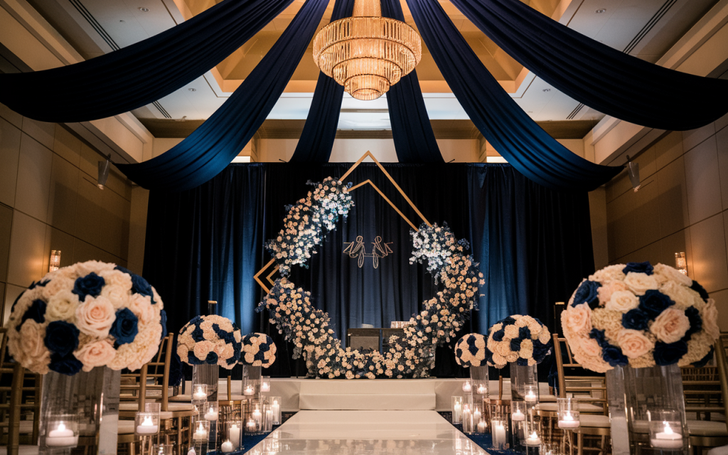 Beneath the grandeur of a shimmering chandelier, this breathtaking wedding ceremony space exudes an air of refined sophistication. Navy drapery cascades from the ceiling, framing a striking geometric arch adorned with blush and ivory florals. A delicate monogram glows softly in the center, a personalized touch that adds intimacy to the opulent setting.