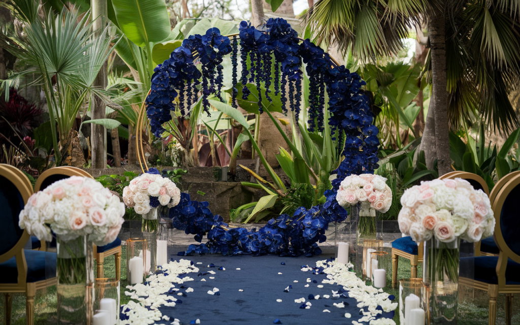 A striking circular arch, dripping in cascading midnight-blue orchids, forms a mesmerizing focal point, standing in bold contrast to the lush greenery beyond. Along the navy velvet aisle, delicate white rose petals create a dreamy path, leading to a scene framed by towering floral arrangements of blush and ivory roses. Gold-accented chairs add a regal touch, their deep blue cushions harmonizing perfectly with the moody elegance of the setting.