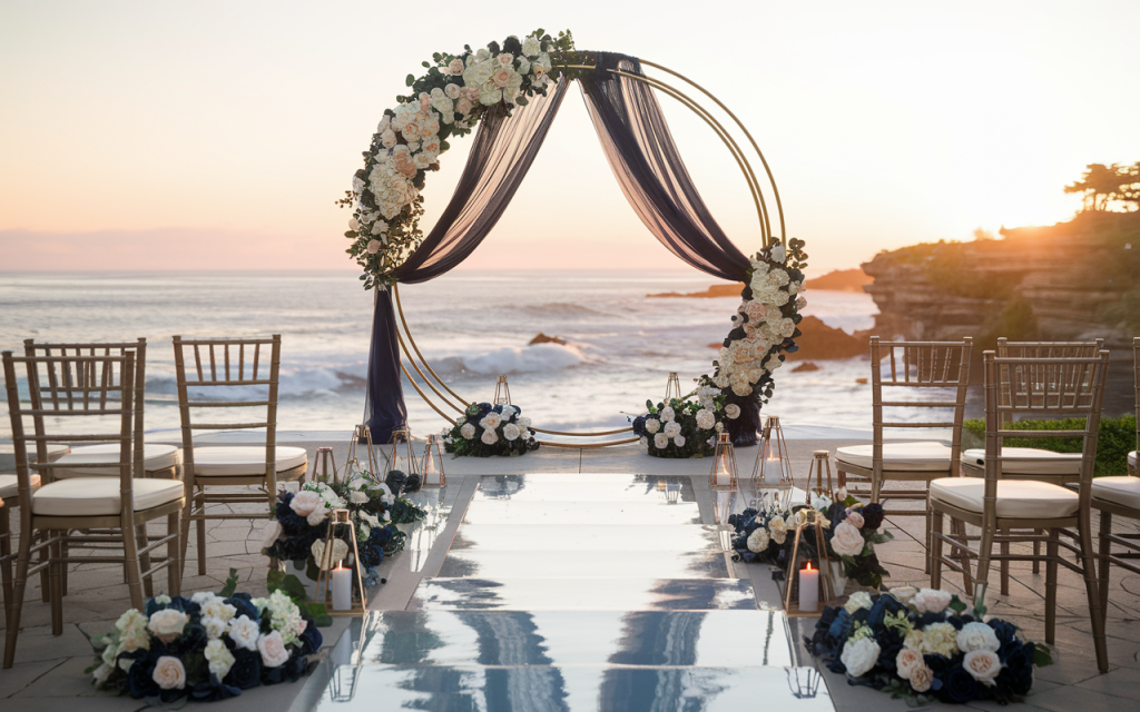 A magnificent circular arch, wrapped in cascading ivory blooms and soft navy drapery, stands as a symbol of eternity against the endless ocean backdrop. A mirrored aisle reflects the warm hues of the sunset, amplifying the ethereal glow as it leads to the altar. Delicate lanterns, flickering with candlelight, line the walkway, their golden tones harmonizing with the soft floral arrangements at each seat.