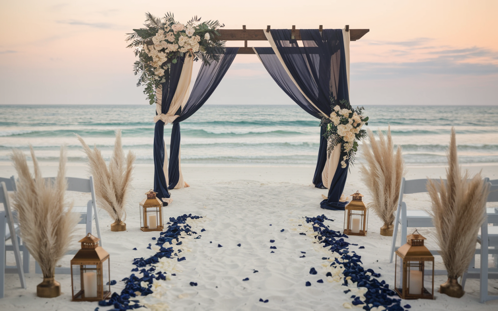 As the waves gently kiss the shore, this beachfront wedding setup invites guests into a serene, dreamlike escape. A rustic wooden arch, draped in deep navy and soft ivory fabric, sways ever so slightly in the ocean breeze. Ivory blooms and lush greenery cascade from the corners, mirroring the natural elegance of the sea.