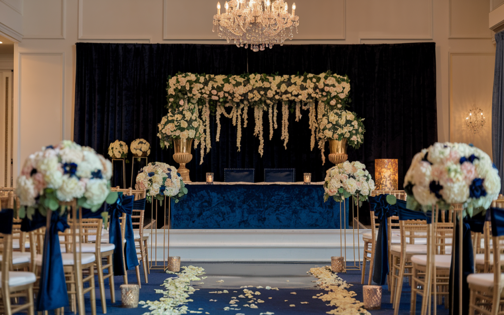 The Regal Elegance wedding setup is a masterpiece of refined luxury, where deep navy hues and gilded accents create an atmosphere of timeless sophistication. Beneath the glow of a crystal chandelier, this indoor ceremony space radiates grandeur, inviting guests into a world of opulence and romance.