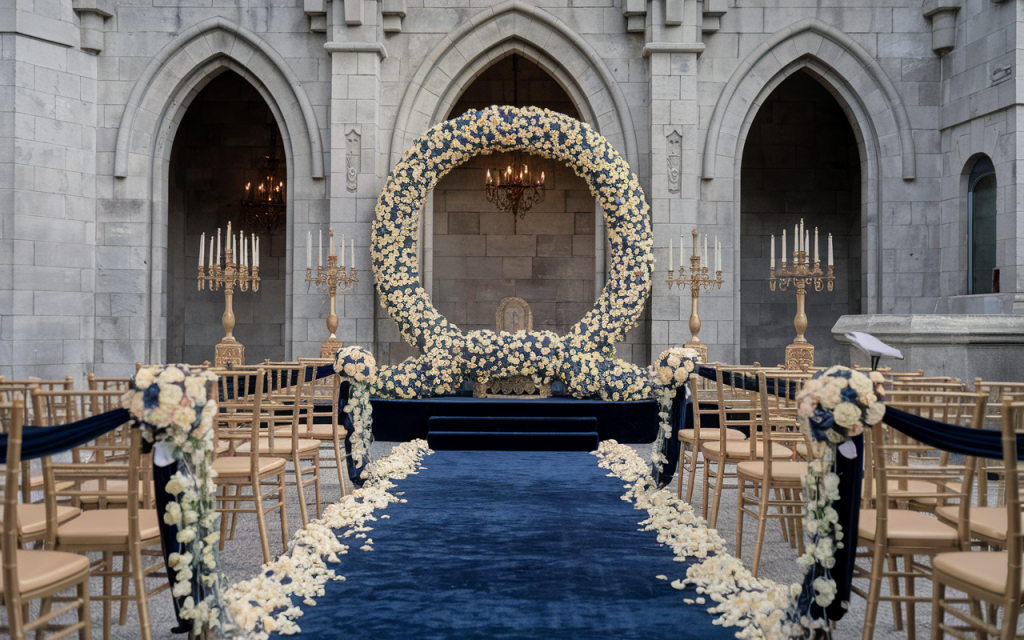 A grand circular floral arch, adorned with ivory and deep navy blooms, stands as the ultimate symbol of eternity, framing the altar in breathtaking beauty. The plush navy aisle, lined with delicate petals, leads to this moment of forever, flanked by golden chairs draped in soft floral garlands. Towering candelabras cast a warm, flickering glow, adding to the medieval romance of the setting.