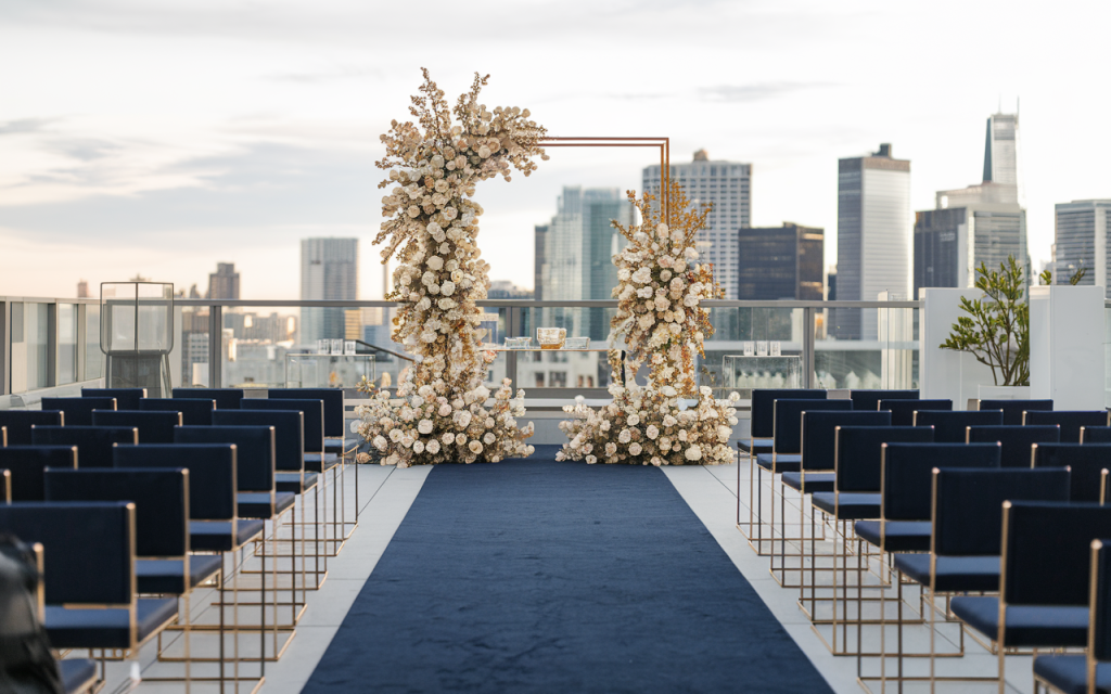 With the city skyline as its breathtaking backdrop, this rooftop wedding redefines urban romance. The sleek navy aisle runner leads to a modern, asymmetric floral arch draped in ivory and gold blooms, perfectly framing the panoramic views beyond. Golden accents glisten in the evening light, adding a warm, luminous contrast to the cool, contemporary setting.
