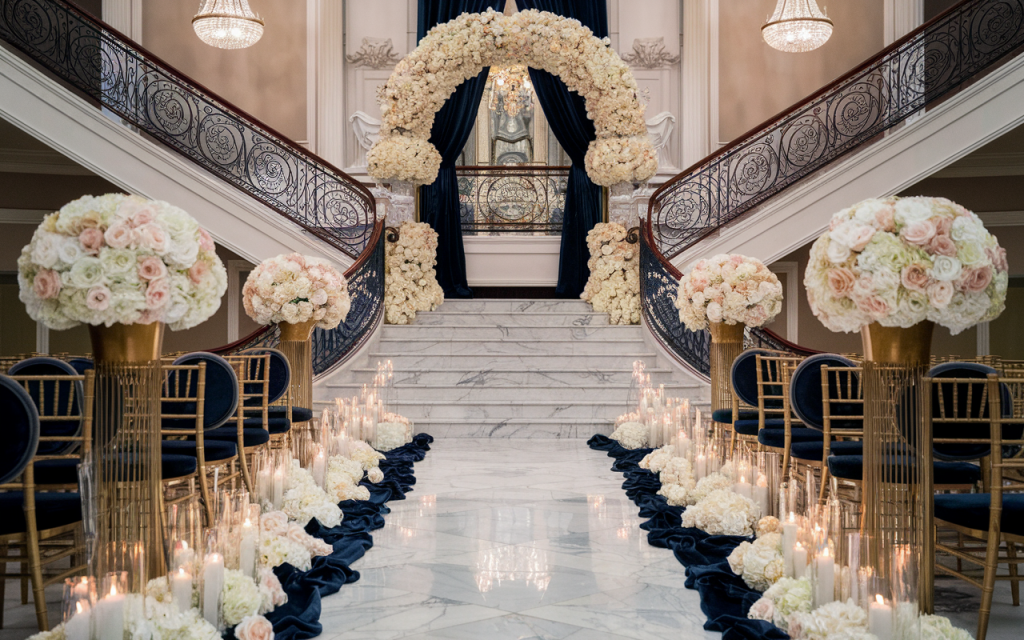 Steeped in grandeur, this breathtaking ceremony setting transforms a stately mansion into a scene fit for royalty. The sweeping marble staircase, adorned with cascading floral arrangements in soft ivory and blush, creates an ethereal path leading to a resplendent floral arch at the top. Delicate candlelight flickers along the aisle, illuminating the rich navy fabric draped elegantly at the base, adding depth and contrast to the luminous setting.
