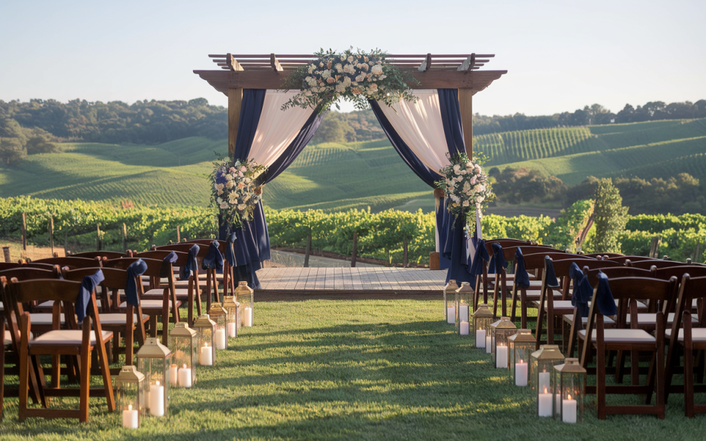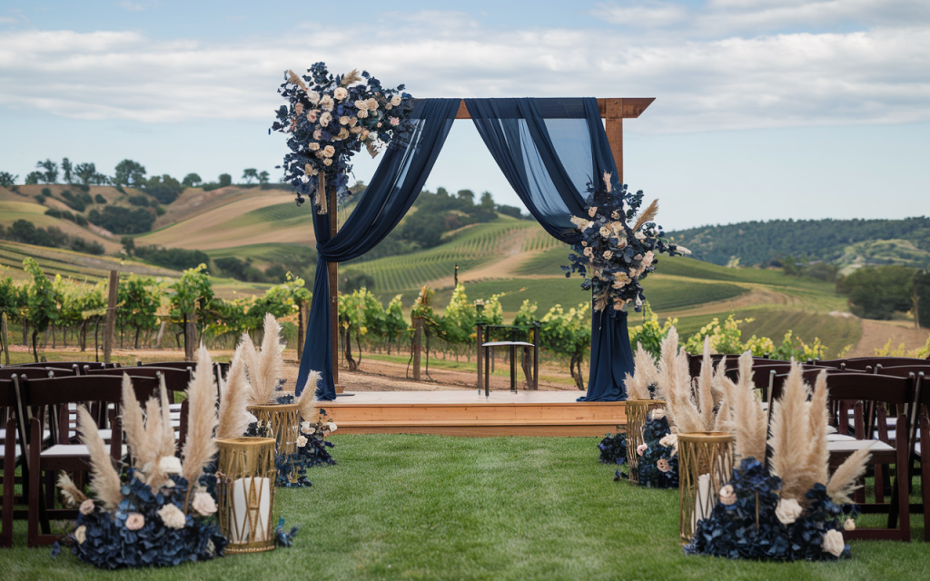 Tucked within rolling vineyards, this breathtaking ceremony setting captures the romance of the countryside with an air of timeless sophistication. The rustic wooden pergola, draped in flowing navy fabric, frames a backdrop of endless vines and golden hills, creating an intimate yet expansive atmosphere.
