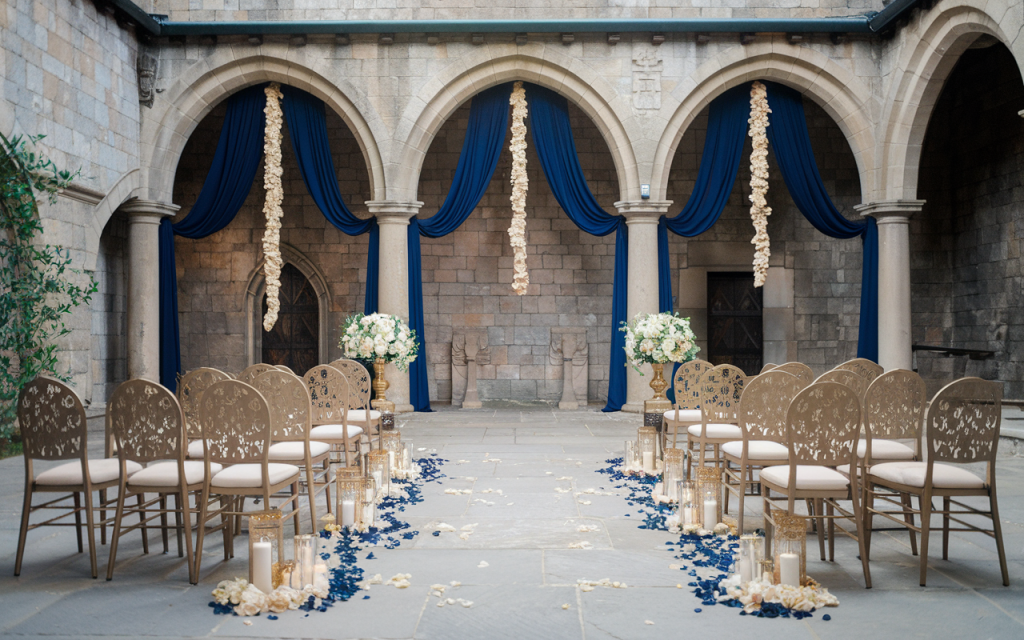 The glow of wall lanterns casts a warm, golden hue, enhancing the intimate atmosphere of this secluded setting. Navy drapery and gold Chiavari chairs line the aisle, creating a regal touch, while scattered rose petals and candlelit lanterns add a dreamy softness. It’s a space where vows feel sacred, embraced by history and elegance.