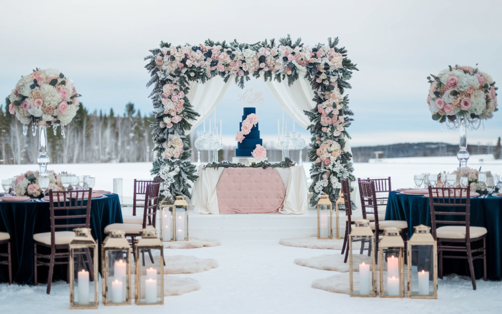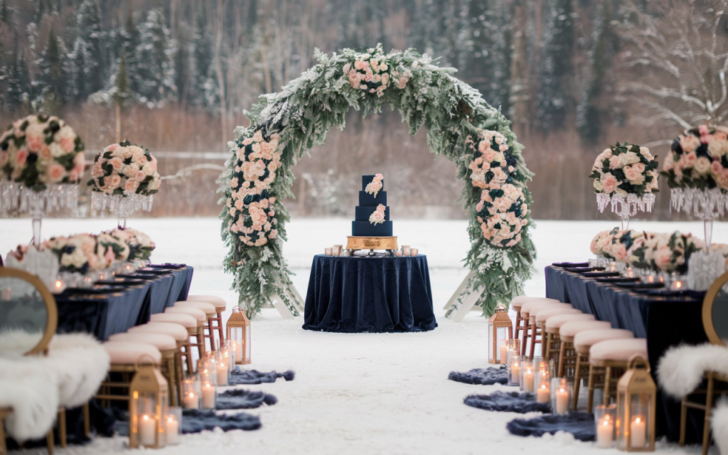 A lush, floral archway in soft pinks, whites, and vibrant greenery frames the altar, where a striking navy and gold wedding cake stands as the centerpiece. Surrounded by rows of candlelit lanterns that cast a soft glow, the aisle is lined with plush navy rugs and elegant fur throws on the seating. Tall floral arrangements grace the reception tables, their crystal embellishments adding a touch of glamour. The rich navy tablecloths, delicate pink napkins, and the gold-rimmed plates create a perfect contrast against the white snow, making the scene feel both luxurious and intimate.