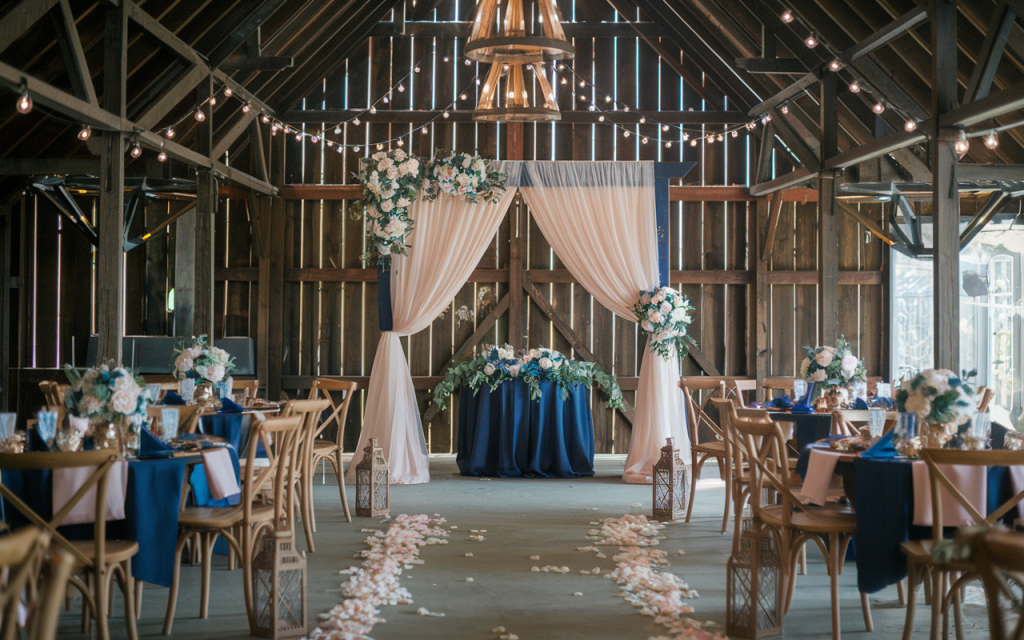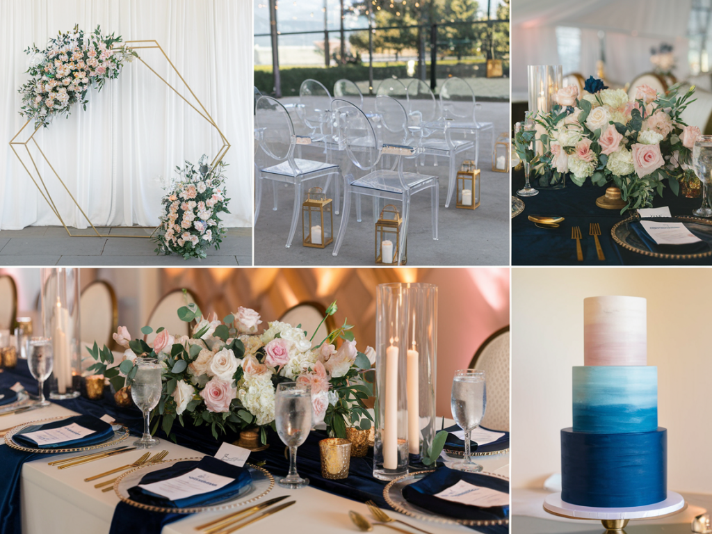 Elevate your wedding celebration with this striking navy and blush wedding design, combining modern elegance with timeless charm. The soft blush tones paired with deep navy accents create an atmosphere of luxury and refinement, perfect for a sophisticated affair.