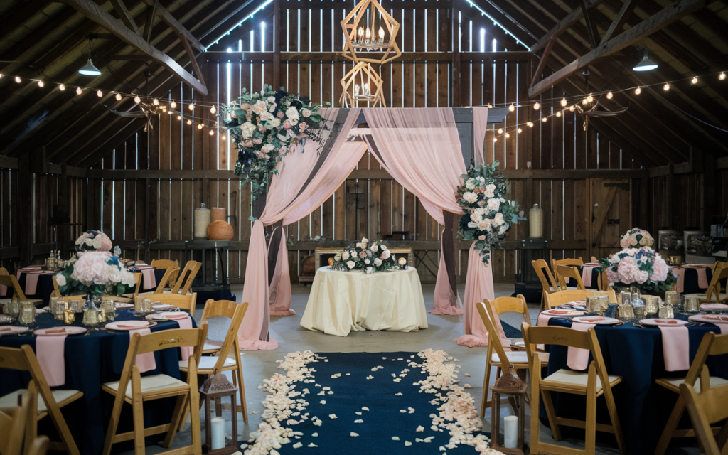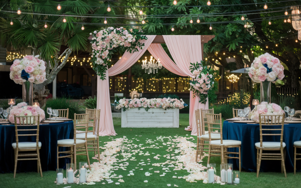 A gorgeous arch adorned with pink drapes and a cascade of florals in soft pink and blush tones marks the ceremony space. The focal point is a charming floral-covered altar with delicate chandeliers hanging from above, casting a warm, inviting glow. The aisle is lined with rose petals, leading guests toward the altar in a sea of soft pastel hues. Reception tables are set with navy blue tablecloths and large, elegant floral arrangements, while golden chairs and candles create a welcoming and romantic environment. The warm light from the string lights above adds a touch of magic, ensuring the night feels enchanting from start to finish.