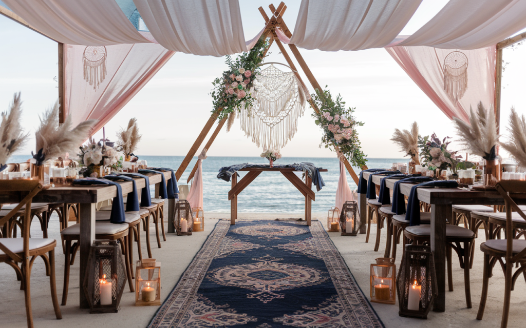 A dreamy, wooden structure frames the ceremony space, draped in blush pink fabric and adorned with lush flowers in shades of pink, peach, and white. A macramé dreamcatcher adds a whimsical touch above the altar. The aisle is lined with beautiful vintage rugs, adding depth and color, while soft, flickering lanterns guide guests toward the couple. Reception tables are arranged nearby, with rustic wooden tables dressed in navy and blush linens, accented by golden vases filled with pampas grass and flowers. The sound of the waves and the glowing sunset backdrop create a perfect atmosphere for this intimate yet grand celebration.