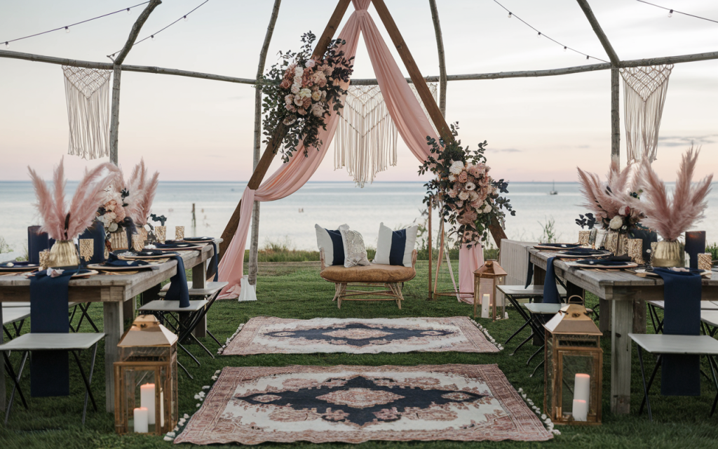 The ceremony area features a striking wooden structure, draped in soft pink fabric and adorned with lush greenery and delicate florals, framing the couple’s altar with an eye-catching dreamcatcher. The deep blue rug guides the couple toward the altar, creating a cozy and beautiful aisle. Reception tables are arranged nearby, each adorned with navy tablecloths and elegant pampas grass centerpieces, complemented by rustic wooden tables. Lanterns with soft candlelight line the walkway, adding a warm glow to the intimate outdoor setting. The tranquil ocean and pastel-colored sky in the background elevate the bohemian yet sophisticated charm of the entire setup.