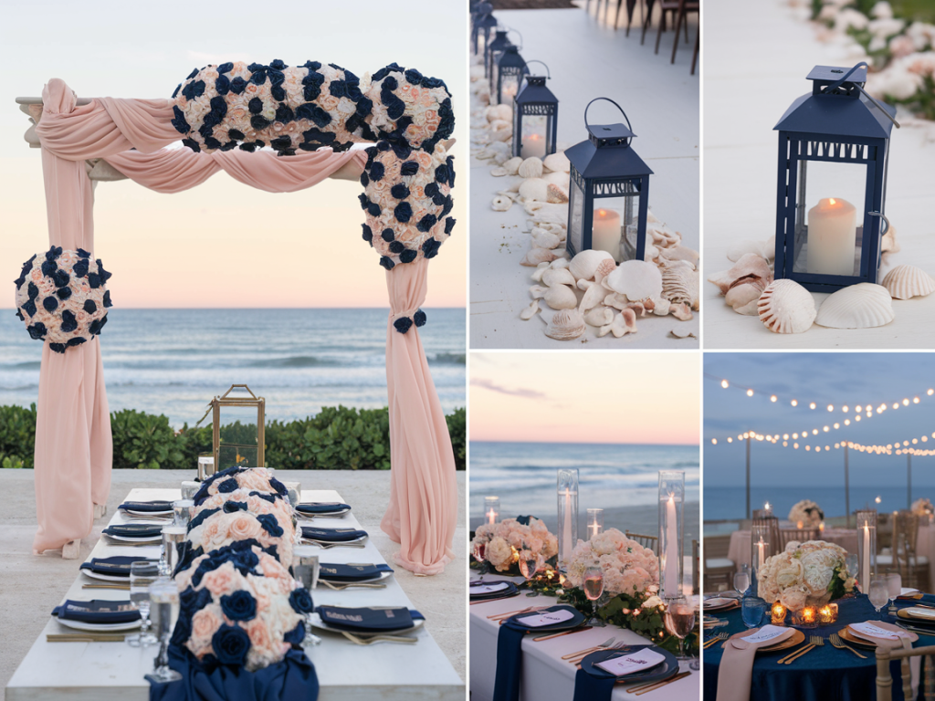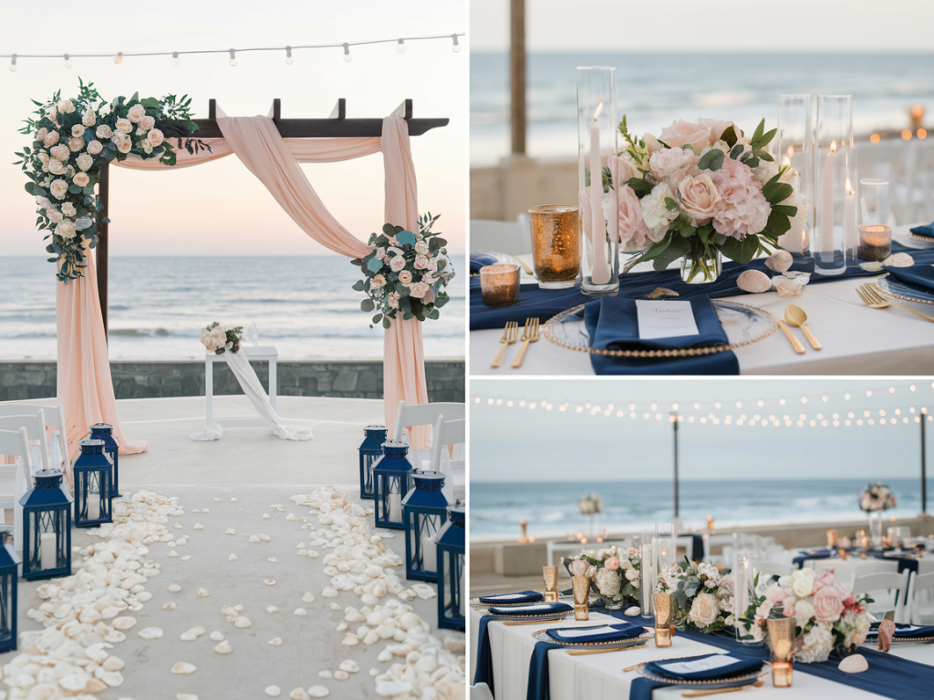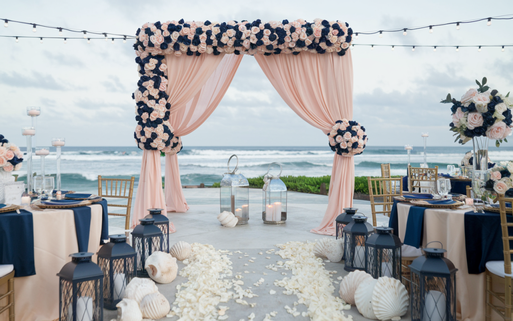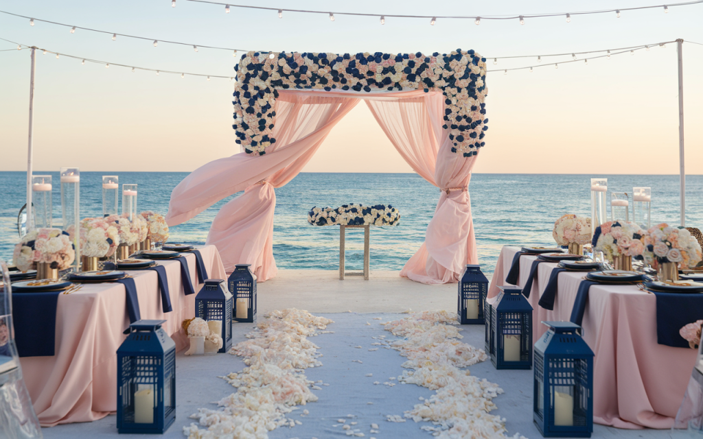The decor features a stunning flower-adorned archway, draped in soft blush fabrics and crowned with navy and white floral arrangements, framing the couple’s special moment. The aisle is lined with lanterns and delicate rose petals, guiding the way to the altar. Elegant, blush tablecloths complement the floral centerpieces, while navy accents on the table settings add a modern, chic touch. The atmosphere is enhanced by tall glass candle holders, casting a soft glow as the ocean breeze gently moves the drapes, creating a dreamlike ambiance. The tranquil setting of the ocean and the soft colors combine to make this a peaceful and luxurious affair.
