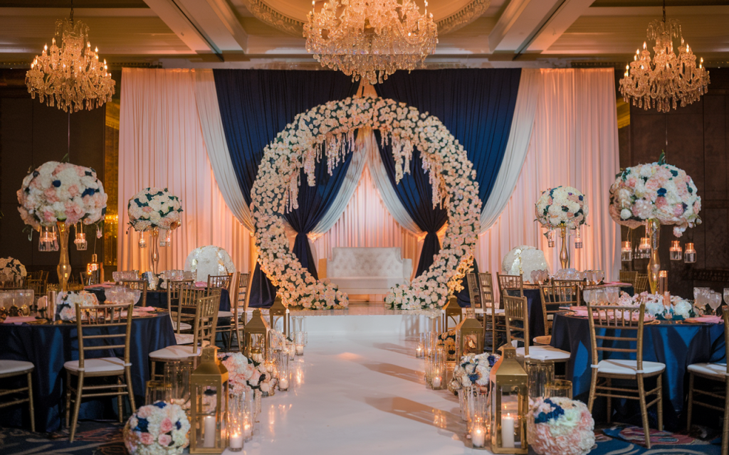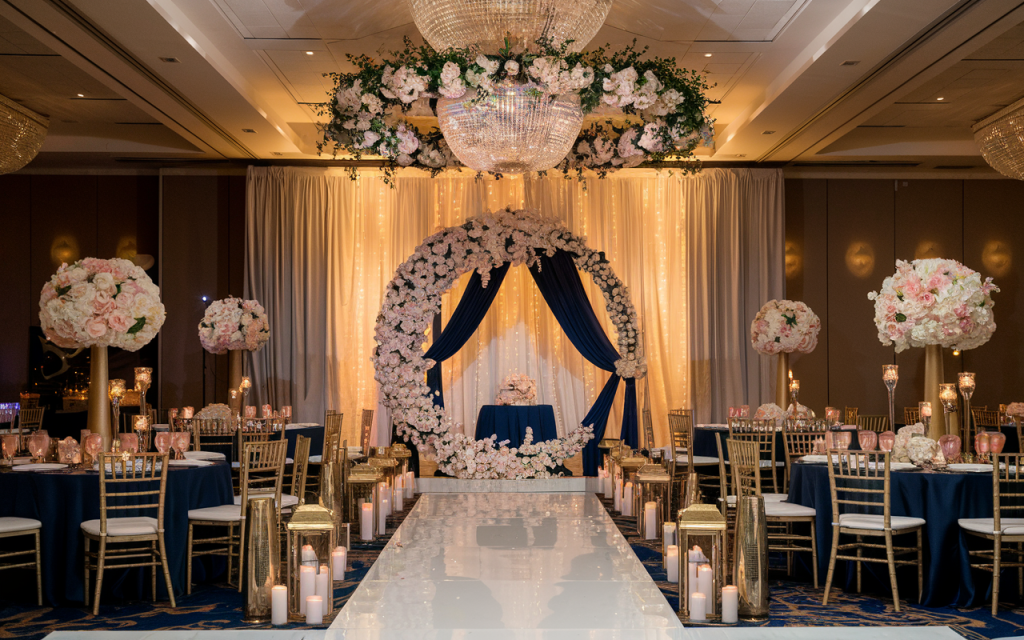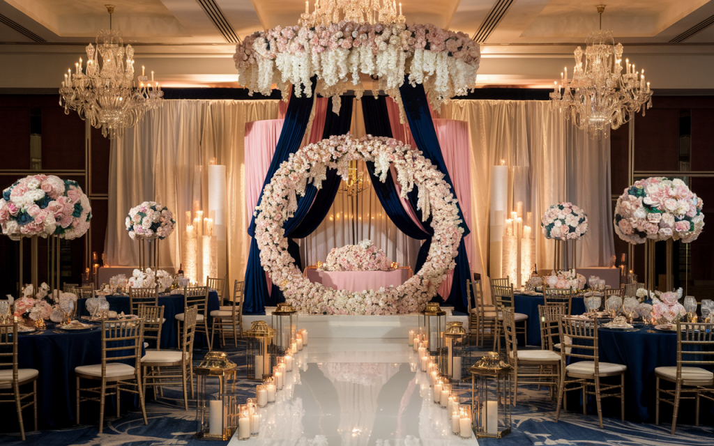 A striking floral circle archway surrounds the couple’s altar, adorned with cascading flowers in shades of pink and white. Deep navy and blush fabric drapes provide a rich contrast, enhancing the romantic, ethereal feel. The aisle is lined with elegant lanterns and candles, casting a soft, flickering glow across the polished white floor, leading guests to the heart of the celebration. Reception tables, set with navy tablecloths and adorned with lush floral centerpieces, capture the same lavish vibe. Tall floral arrangements atop gold vases and additional floral accents add a touch of whimsy and glamour to the space. Crystal chandeliers overhead provide dazzling light, adding a final touch of opulence to the evening.