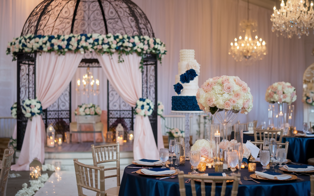 The striking centerpiece of this design is a delicate, ornate wedding gazebo, draped in soft blush fabric and adorned with lush floral arrangements in shades of navy and blush. The surrounding space features crystal-clear vases filled with elegant roses and hydrangeas, set on tables dressed in rich navy linens with gold-rimmed chargers, creating a regal and intimate ambiance. A stunning wedding cake, beautifully designed with intricate navy rosettes, stands proudly next to the gazebo, serving as a focal point for the celebration. Soft candlelight flickers from elegant lanterns and crystal candleholders, casting a warm glow across the space. The chandeliers above add a touch of glamour, elevating the atmosphere and making this setup truly fairytale-worthy.