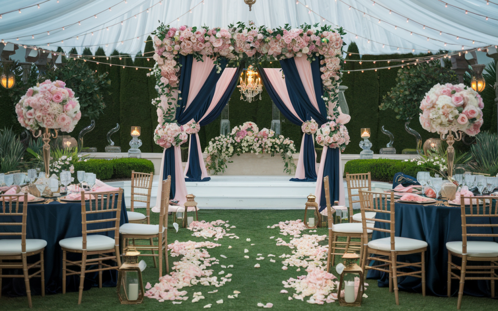 A stunning floral arch sets the stage for the ceremony, with cascading roses in soft pink hues and lush greenery framed by deep navy and blush drapes. Below the arch, a meticulously arranged floral altar completes the romantic look, bringing the focus to the couple as they exchange vows. The aisle is lined with delicate rose petals, creating a beautiful path for the guests. Reception tables mirror the soft and sophisticated color palette with navy tablecloths, pink napkins, and tall, ornate floral centerpieces that bring the theme to life. Golden lanterns add a warm glow, accentuating the romantic ambiance beneath the twinkling lights overhead.
