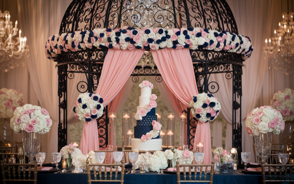 This design is centered around a stunning floral-covered gazebo, with soft pink drapes flowing gracefully from the top, framing a lavishly adorned four-tier wedding cake. The gazebo is beautifully wrapped in a cascade of blush and navy flowers, creating a striking focal point for the celebration. Elegant crystal chandeliers hang above, adding a touch of sparkle to the surroundings. The tables are adorned with soft pink tablecloths and floral arrangements in tall glass vases, giving the space a sophisticated yet romantic vibe. The warm glow from the candles placed around the gazebo and on the tables enhances the intimate and magical feeling of the decor.