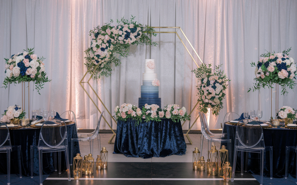 The design centers around a bold geometric floral arch, elegantly framing the wedding cake, which features ombre shades of navy and blush, topped with delicate rose details. Surrounding the cake table, soft, lush floral arrangements in shades of blush and navy add depth and beauty. The tables are draped in rich navy velvet, creating a luxurious base for the golden chargers and crystal-clear glassware. Tall floral centerpieces atop sleek gold stands draw the eye upwards, while gold lanterns line the floor, casting a warm and romantic glow throughout the room. The backdrop of soft, shimmering fabric elevates the entire setup, setting a refined and glamorous tone.
