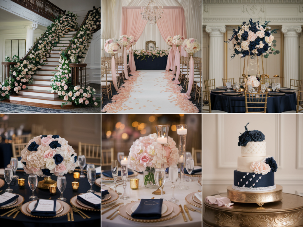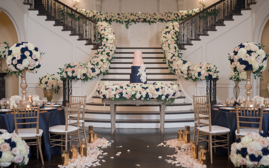 This exquisite wedding setup seamlessly blends classic elegance with modern charm, featuring a stunning combination of navy and blush tones that evoke romance and sophistication. The graceful staircase, adorned with lush florals, sets the stage for a memorable event filled with elegance and warmth.