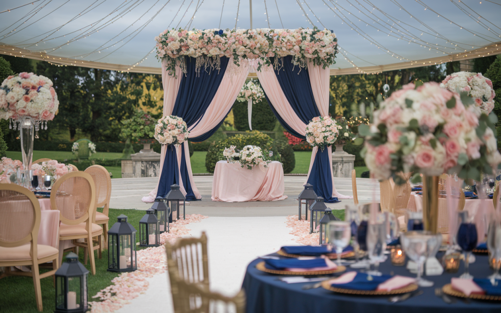 Step into a world of timeless romance with this navy and blush wedding setup, designed to captivate with every detail. The soft pinks and deep navy hues create a perfect balance between elegance and warmth, setting the stage for a truly unforgettable celebration.