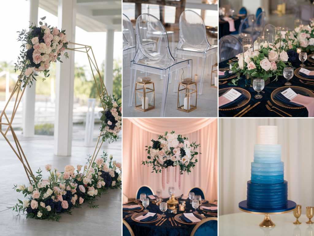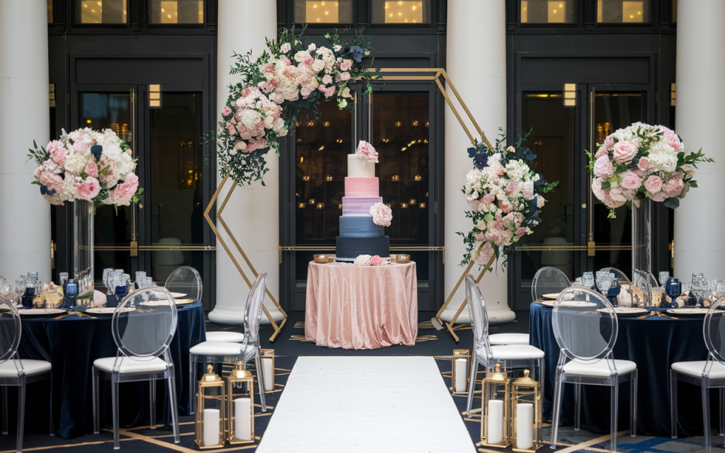 Step into a world of modern elegance with this striking navy and blush wedding setup that blends sophisticated style with contemporary design. From the geometric floral arch to the sleek gold accents, every detail has been thoughtfully curated to create a chic and glamorous atmosphere for your special day.