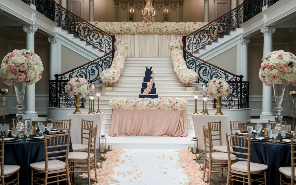 The focal point of this design is the grand staircase, where soft blush and ivory blooms cascade down the railing, creating an opulent and inviting look. The reception area is highlighted by a beautiful navy-and-blush tiered wedding cake, positioned on a luxurious table draped in shimmering rose gold fabric. Tall floral arrangements in crystal vases accentuate the refined atmosphere, while soft candlelight from golden candleholders provides a warm, intimate glow. The aisle is lined with scattered rose petals, adding a touch of romance to the scene. This meticulously crafted decor radiates luxury and elegance, creating a breathtaking setting for a dream wedding.