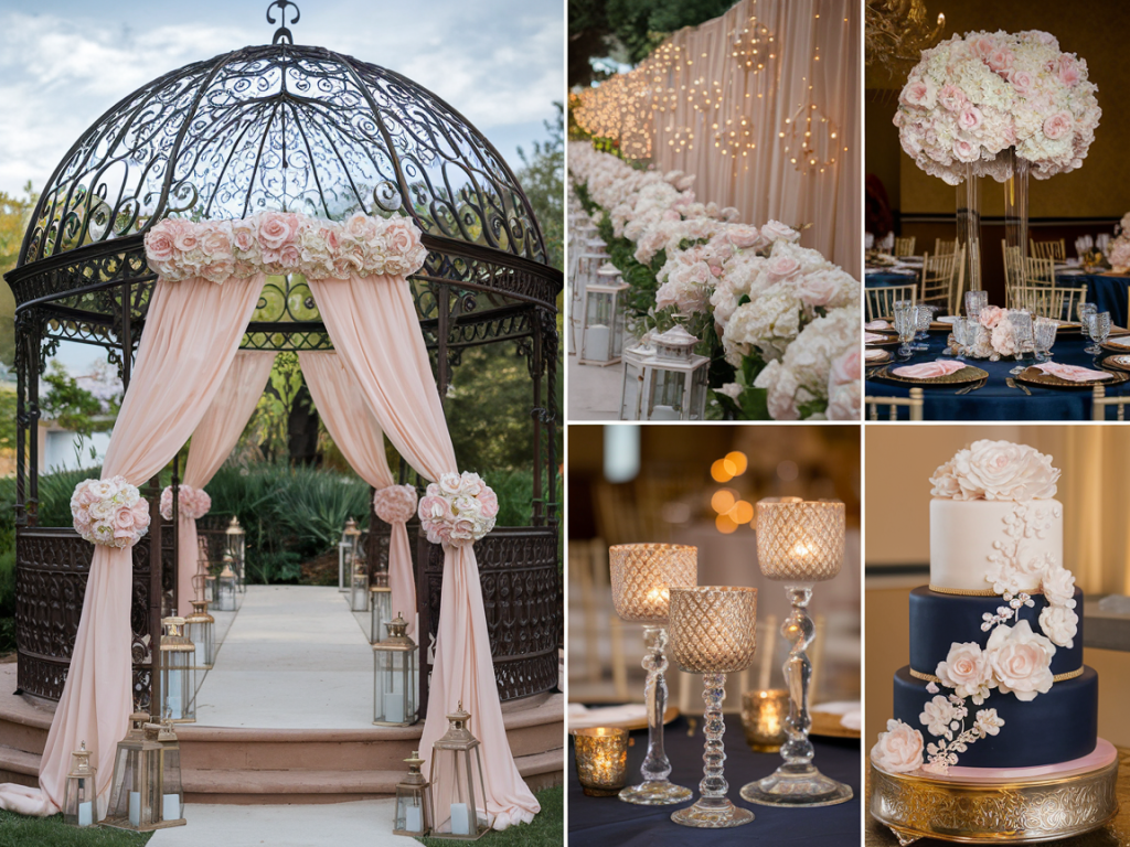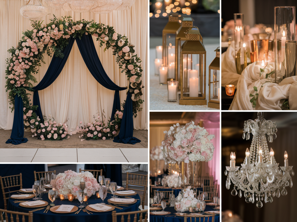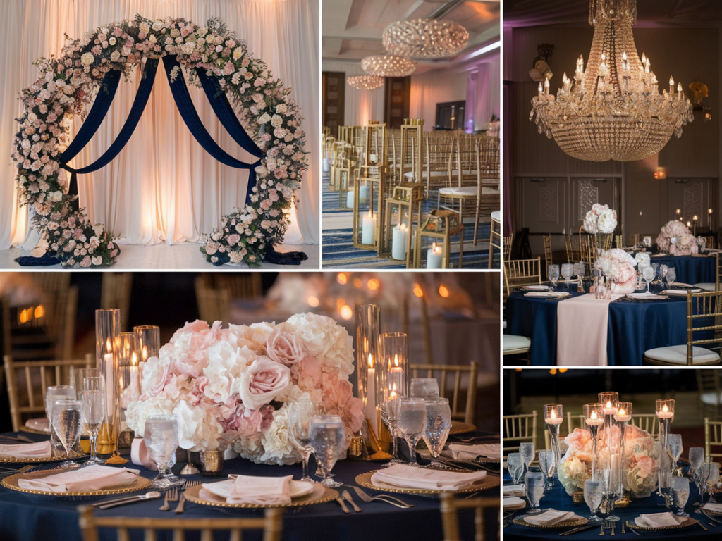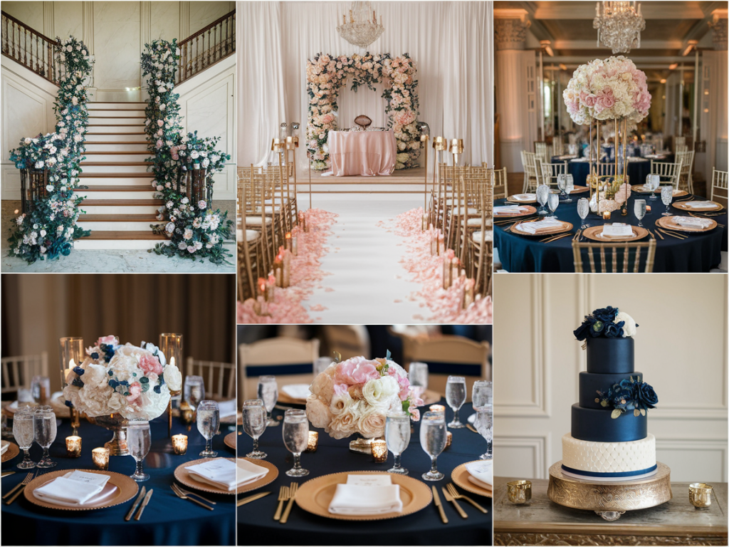 This decor is perfect for couples seeking a grand ballroom wedding with a luxurious yet romantic feel. Ideal for high-end venues with grand chandeliers and ample space, this design adds a touch of glamour and elegance to any upscale event. The mix of navy and blush with golden accents works beautifully for both evening and daytime weddings, making it perfect for a timeless celebration filled with beauty and sophistication.