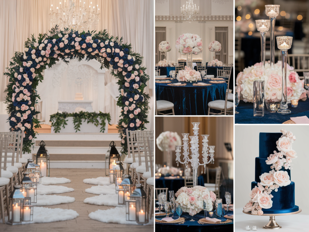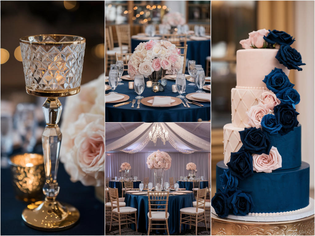 Perfect for a lavish wedding, this setup is ideal for couples seeking a refined and timeless celebration. Whether in a grand ballroom or an elegant mansion venue, this decor suits upscale weddings and events looking to blend elegance with a touch of modern glamour. The combination of navy and blush hues makes it a perfect choice for both spring and summer weddings.