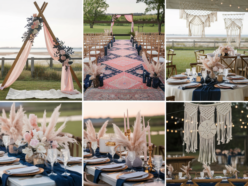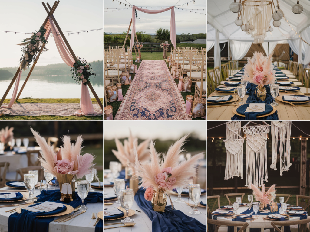 This setup is ideal for couples dreaming of a bohemian beach wedding, perfect for outdoor, waterfront venues with stunning views. Whether on a private beach, resort garden, or an open space by the ocean, this chic, laid-back decor with a touch of elegance is perfect for those who wish to celebrate in a natural, yet luxurious environment. The combination of navy and blush tones adds a modern twist to the bohemian style, making it a perfect choice for couples seeking a unique, unforgettable wedding.