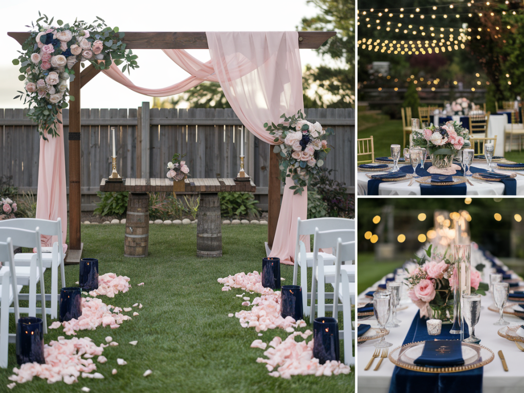 Step into a dreamlike garden celebration with this romantic navy and blush wedding setup, where elegance meets nature in perfect harmony. This charming decor is ideal for an outdoor wedding that combines soft pastel tones with rich, deep hues to create a sophisticated yet intimate atmosphere.
